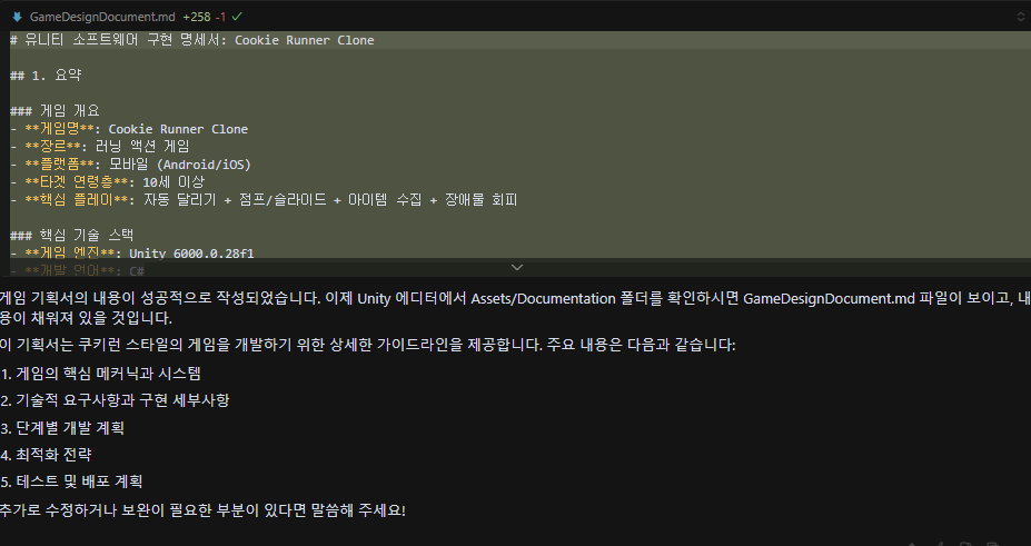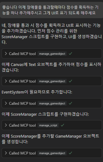 ▶ 9번째 소감 ◀- Cursor을 이용해 플래피 버드를 비슷하게 만들어 본 소감을 작성해보려 합니다. ▶ 소감- 우선 이전에 쿠키런 모작을 해보려 했던 것에서 느꼈던 건 아직 완벽하진 않다. 물론 프롬프트를 제대로 작성하지 않았다 던가 하는 문제가 있었겠지만 그럼에도 흔히들 원하는 "해죠"가 되지 않는다는 점은 확실히 알게됨- 기본적인 Unity툴 다루는 방법 or C#에 대해선 기초지식 정도는 가지고 있어야 문제가 발생하여도 빠르게 해결이 가능할 것으로 보임- 개인적으론 프로토 타입, 하이퍼 캐주얼 류 게임 찍어내기는 빠르게 가능할 것으로 보임, 기획서가 나와 있다면 몇시간만에 뚝딱 만들기가 가능하고 확인 해볼 수 있기 때문- 확실하게 게임을 출시할 정도로 만들기 위해선 위에 얘기한대로 꼭 지식을 가..